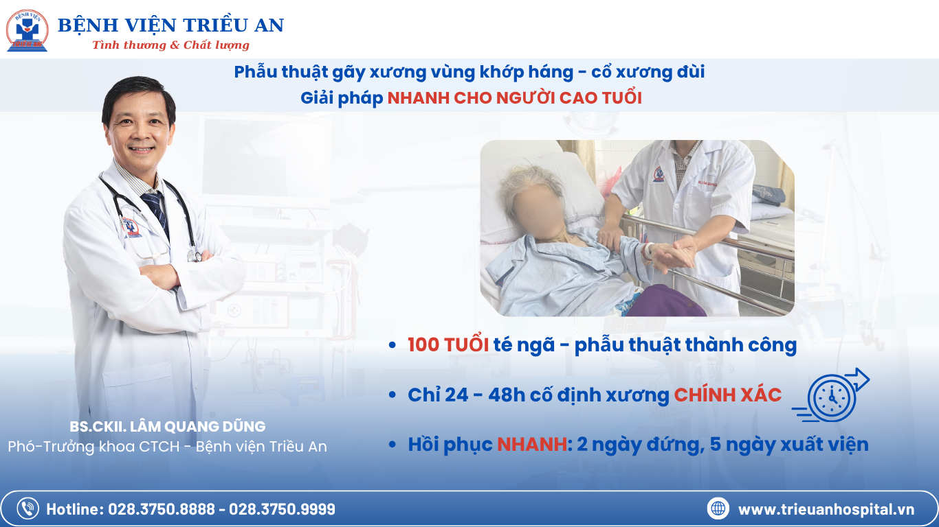 Vừa qua, Khoa Chấn thương chỉnh hình – Bệnh viện Triều An đã thực hiện thành công ca phẫu thuật điều trị gãy xương vùng khớp háng cho một bệnh nhân đặc biệt trên 100 tuổi, giúp bệnh nhân vận động trở lại chỉ sau 2 ngày.